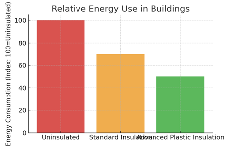 Buildings account for nearly 40% of global energy use and CO₂ emissions (IEA). Plastics make a measurable difference: advanced insulation foams can reduce heat flow through walls by 20–70%, cutting heating/cooling bills by up to 50%.