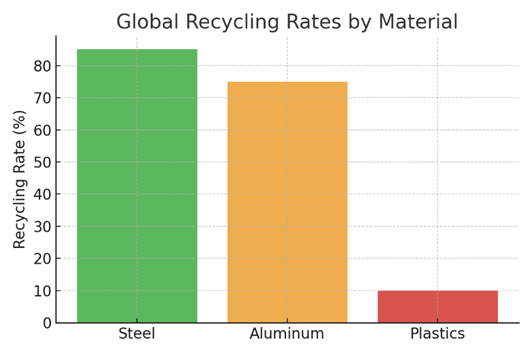 Metals such as steel and aluminum achieve high recycling rates (75–85%). Most plastics remain below 10%.